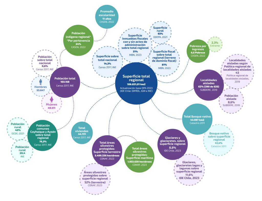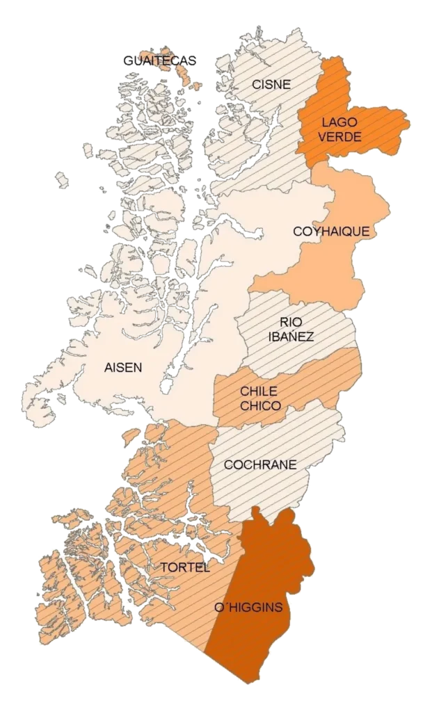 Lo anterior, equivale a la distancia entre Santiago a la ciudad de Victoria (VIII región), es decir cruzar 5 regiones. Se conforma de 4 provincias (Aysén, Capitán Prat, Coyhaique y General Carrera) divididas en 10 comunas.