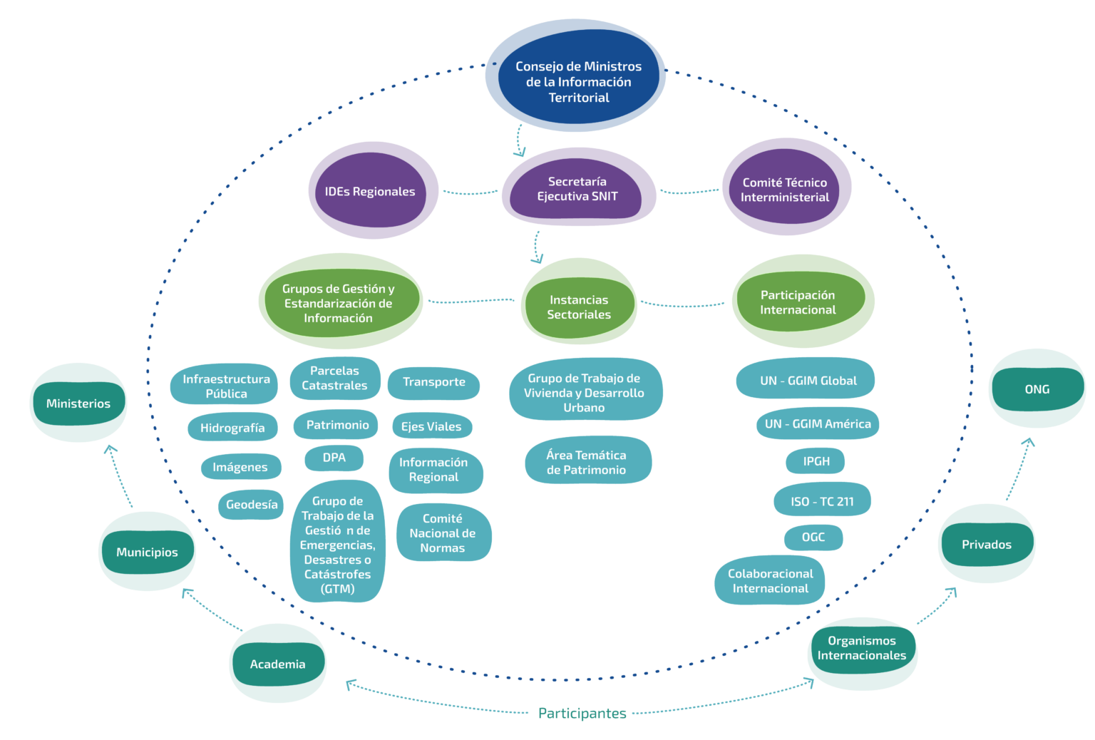 La IDE Chile, dependiente del Ministerio de Bienes Nacionales, se estructura en diferentes niveles, roles y articulaciones, en donde las IDEs regionales, tienen la misión de llevar a cabo la coordinación regional, a través de los Gobiernos regionales. A continuación se presenta la estructura de la IDE Chile según Decreto Supremo 28-2006 del Ministerio de Bienes Nacionales.